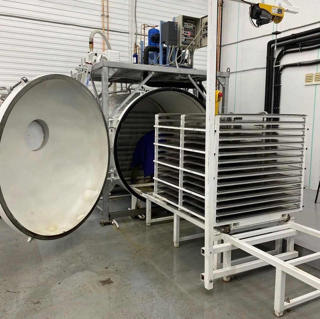 Then, freezing takes place in a special section. The freezing temperature varies for different products and ranges from 20 degrees below zero to 200 degrees below zero. It is necessary to reach a temperature below the product’s solidification point as quickly as possible, so that very small ice crystals form. These crystals do not destroy the structure of the product and evaporate more easily.